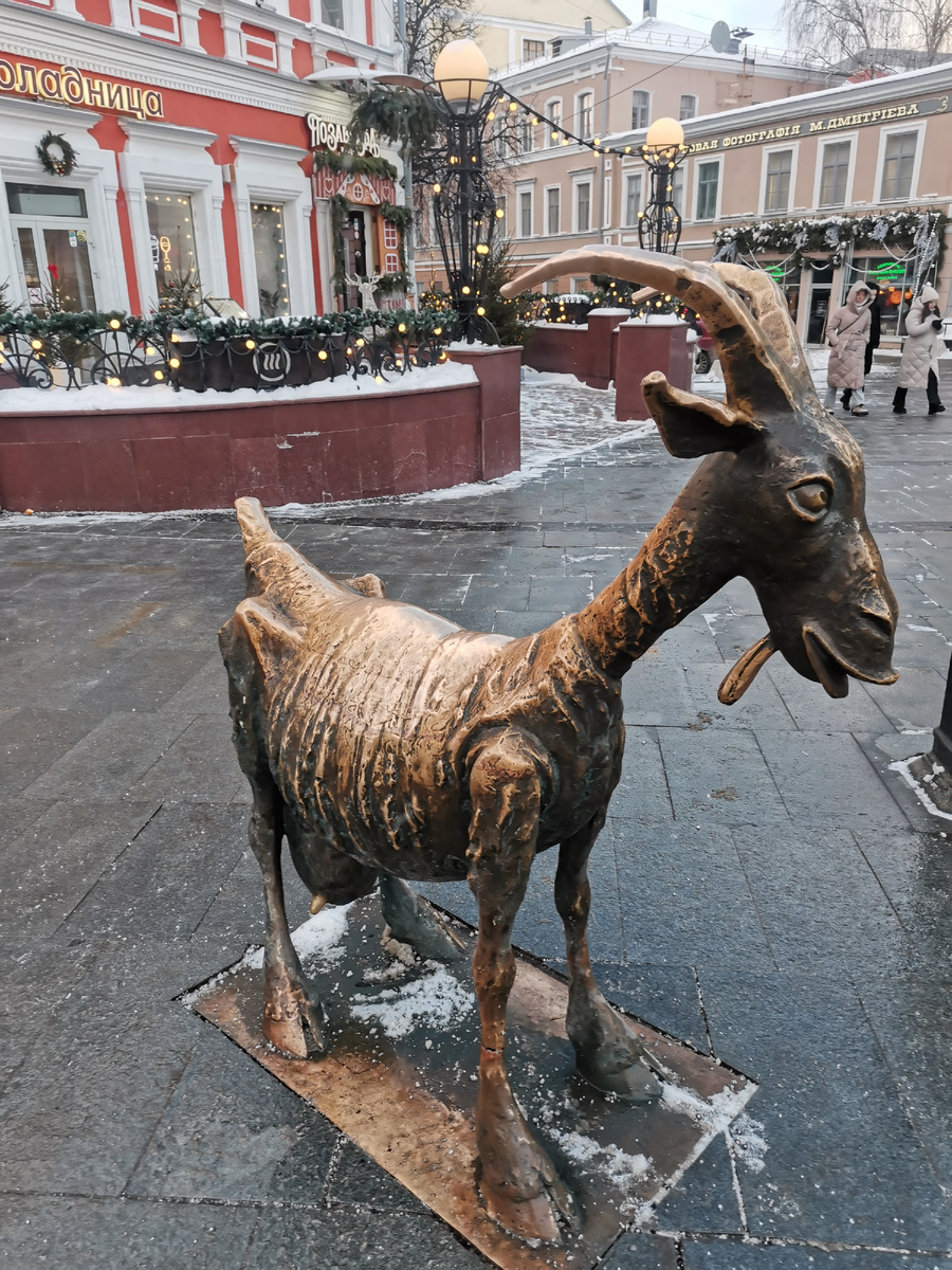 Люблю я Покровку. Улица, которые многие называют нижегородским Арбатом, берет свое начало от площади Минина. Много всяких скульптур можно здесь встретить. О некоторых я уже рассказывала, вот, например, про фотографа. Но сегодня мы остановимся у дома . N8. Около этой скульптуры всегда много и детворы, и взрослых- и у козы, и на козе. Особенно у козы любят останавливаться гиды с экскурсионными группами, рассказывая различные истории. Хотите послушать? Итак, история первая-героическая. Примерно в 17 веке (а может быть и раньше нам это не ведомо), случился пожар в посаде, что в то время было не редкостью. Все спали, храпели, в ус не дули. И вот когда огонь дошел до сарая с домашними животными, коза решила, что спасение это, как говорится, дело рук утопающих, вырвалась из строения и рванула прочь от пожара, сломя голову. Так бежала, что остановил её только столб с колоколом. Коза врезалась,запутавшись рогами в веревках, колокол зазвенел и разбудил жителей. Горожане спаслись, козе выд
