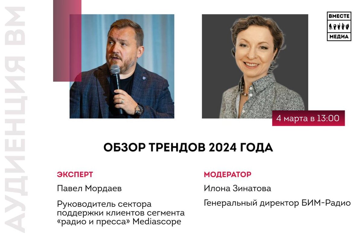Обзор трендов 2024 года Сегодня, 4 марта в 13.00 по московскому времени, проведём Аудиенцию с Павлом Мордаевым, руководителем сектора поддержки клиентов сегмента «Радио и пресса» Mediascope. Под модерацией Илоны Зинатовой, генерального директора БИМ-радио, обсудим ключевые тренды 2024 года и особенности медиапотребления по данным исследований. Какие тренды прошлого года ещё актуальны, какие — уже нет? После Аудиенции вы сможете найти для себя ответ на этот вопрос. Ждём вас сегодня в 13.00 по мск. Регистрация Вместе Медиа