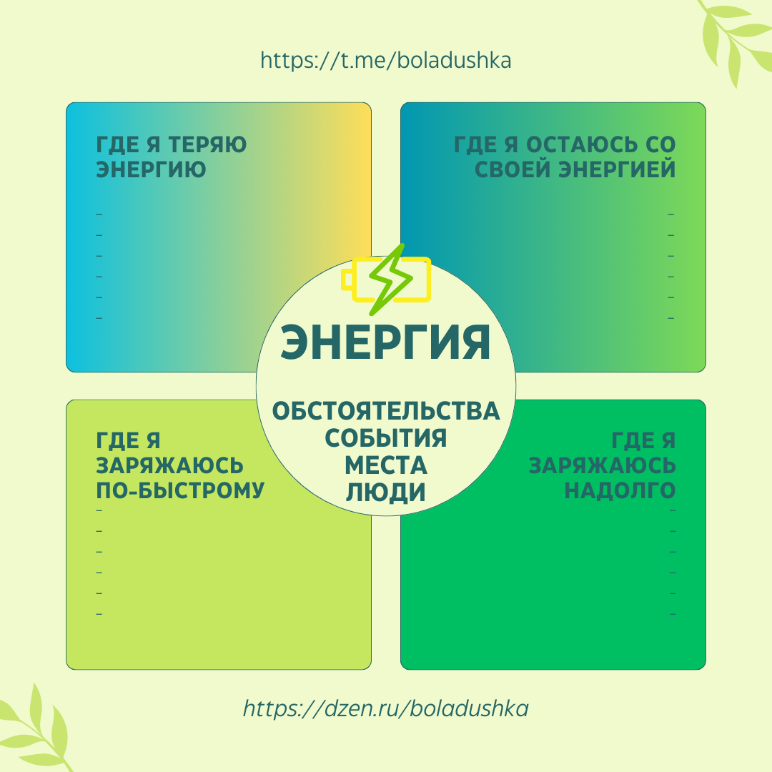На курсе по Сказкотерпии Елены Журек нам рассказали, как управлять уровнем своей энергии, чтобы не выгорать и не лишаться сил. Делюсь инструкцией, которой пользуюсь сама: 1. Разделите лист на 4 части 2. Постепенно подмечайте и вписывайте в каждую часть какие Люди, Места, События, Занятия, Материалы, Звуки, Цвета и пр.: Условная норма внутренней энергии в конце рабочего дня: 🚀 60-70% Предел, за который заходить нельзя: 30% энергии! Кредитоваться у своего здоровья - путь к выгоранию и длительной болезни. 🤒🤕🤧 Берегите себя и помните формулу подзарядки: ДЕЙСТВИЕ - УСИЛИЕ - КАЙФ Не "полежать в кроватке с котиками мемами", а Встать, наполнить себе ванную - Усилием воли в нее погрузиться - Расслабиться и пополнить запасы своей энергии. Готовы отдохнуть и подзарядиться? Создала для вас инфографику - делитесь с близкими по духу, используйте сами. Цените и берегите себя!