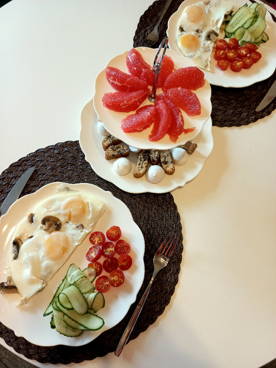 7.00 подъем по будильнику, привожу себя в порядок и скорее к плите. На завтрак ничего особенного: Яичница с грибами, овощи, и печенье с зефиром к чаю.