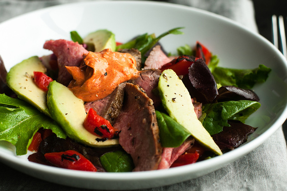 В старинном замке, окутанном туманом, жил алхимик-повар, чьи кулинарные шедевры граничили с магией. Однажды, вдохновленный древними гримуарами, он решил создать салат, способный пробуждать забытые воспоминания. Для этого он взял отборную говядину (250 г), следуя рецепту: отбил, замариновал в оливковом масле, тимьяне и перце, а затем обжарил до совершенства. Стейк, завернутый в фольгу, словно хранил в себе тайну времени. Пока мясо "отдыхало", алхимик запекал перец (1 шт.) в духовке, а сам готовил айоли – соус, в котором желток (2 шт.), чеснок (4 зубчика) и оливковое масло (250 мл) сливались в мистической гармонии. В глубокой тарелке встретились салатные листья (125 г), запеченный перец, оливки (6 шт.) и авокадо (1 шт.), сбрызнутое лимонным соком (5 мл). Сверху возвышались слайсы говядины, увенчанные айоли. Каждый ингредиент, словно элемент алхимической формулы, пробуждал в едоке вихрь эмоций и образов. Говорили, что этот салат не только утоляет голод, но и открывает двери в иные миры, г