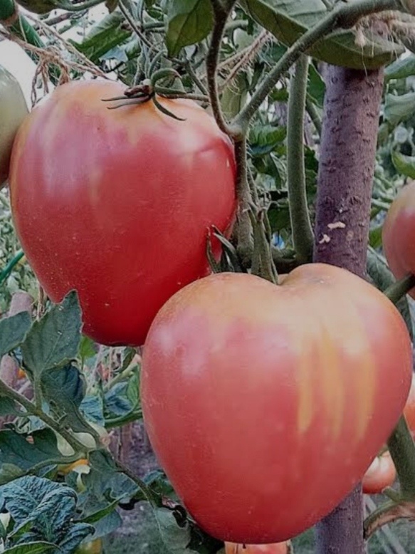 Плоды около 300 грамм, сердцевидной формы, с сахарной мякотью, классического томатного вкуса.