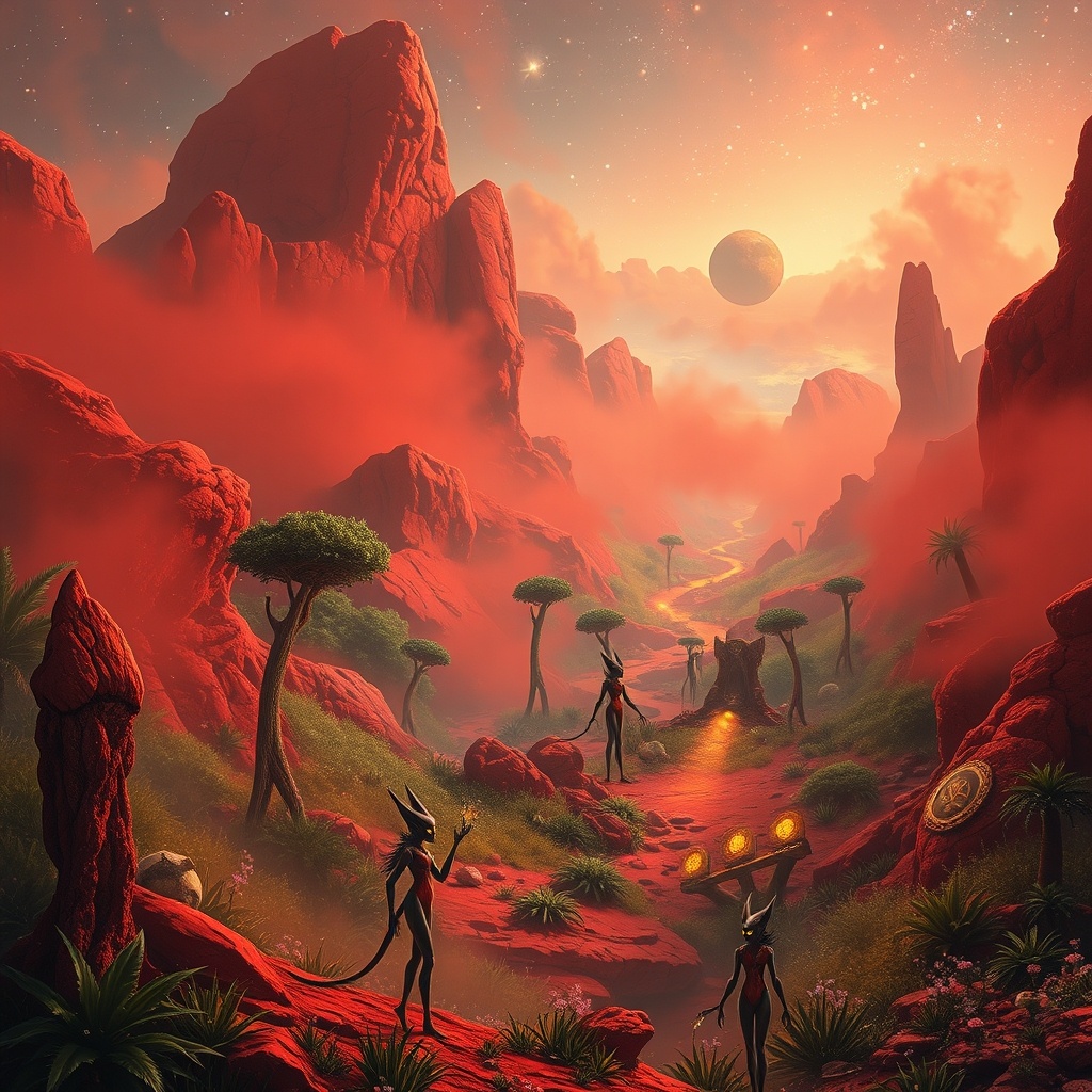 В глубинах космоса, на удалённой планете, омываемой багровыми туманами, находилась загадочная страна Парм Марс. Это было место, где природа и технологии сплелись воедино, создавая уникальный баланс. Страну заселяли марсиане — высокие, стройные существа с кожей цвета красного песка и глазами, сверкающими как звёзды. Их культура была насыщена мифами о древних богах, которые, согласно легендам, подарили им знания и силу. Главный герой этой истории, молодой марсианин по имени Элир, был мечтателем. Он каждый вечер наблюдал за светилами, размышляя о том, что находится за пределами их планеты. Элир мечтал о путешествиях, о том, чтобы увидеть другие миры, и его сердце стремилось узнать правду о легендах, которые передавались из поколения в поколение. Однажды, в ходе своих размышлений, Элир наткнулся на старинный свиток в библиотеке своего деда. Свиток содержал карту, указывающую на затерянный храм, построенный в честь бога путешествий и знаний — Тарили. Легенда гласила, что в храме хранится