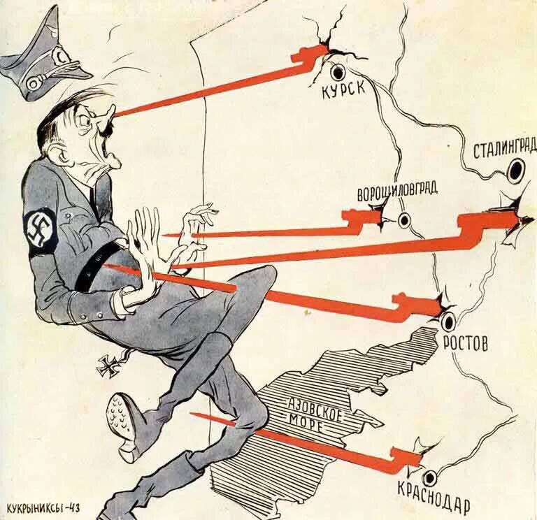 Когда Кукрыниксы смеялись над Гитлером, мы всерьез собирались Гитлера повесить, Германию демилитаризировать и денацифицировать, фашизм уничтожить, пособников Гитлера закопать. И на это работали миллионы бойцов и офицеров. И на это работал тыл, включая детей. На это работали все артисты страны. И все мужики страны знали, что их призовут в любую минуту. И они пойдут, куда прикажут. И главные газеты страны публиковали на первых полосах стихи Твардовского и «Они сражались за родину» Шолохова.