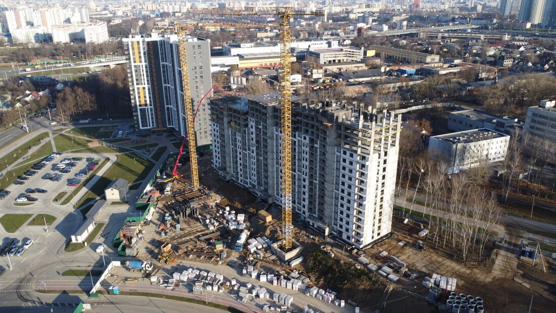 В районе улицы Железнодорожной в Минске строится третий дом жилого комплекса «Дубравинский». Осваивает этот участок застройщик «БелБизнесРесурс». Первые два дома ЖК сдали в эксплуатацию еще в 2023-м году, а сейчас тут возводят еще одну высотку на 493 квартиры. Сегодня в газете «Минский курьер» были опубликованы изменения в предыдущую декларацию застройщика. Увеличились цены (может, виноват упавший доллар?) на все оставшиеся квартиры – однушки, двушки, трешки и четырешки. МинскЯндекс Карты — транспорт, навигация, поиск мест В строящемся монолитном доме (по генплану − № 5) будет 21 этаж, 3 подъезда и сразу 493 квартиры. Возводить многоэтажку начали в апреле прошлого года, а сейчас строители работают на уровне последних этажей. Процент строительной готовности третьего дома на начало марта составлял 60%. Закончить третью многоэтажку по документам должны во втором квартале 2026 года, но возможно это произойдет и раньше (такая практика у застройщика есть). Продажи в третьем доме стартовали п