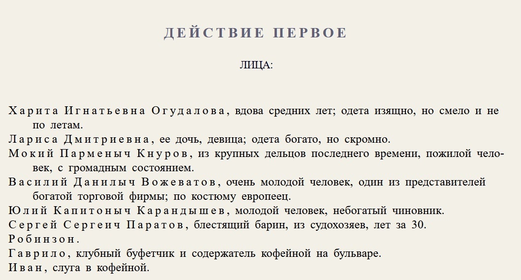 Знаете ли, что вы, что все имена и фамилии в "Бесприданнице" что-то означают и имеют дополнительные смыслы? Причем ряд этих смыслов с годами мы уже перестали считывать, а в то время читатели всё прекрасно понимали. Например, Огудаловы - на наш взгляд обычная фамилия. А между тем, раньше был глагол "огудать" - обмануть, надуть, провести, облапошить. Огудала - плут, мошенник. Ну просто наша Харита Игнатьевна, которая крутит свои интриги и объегоривает всех, кто попался под руку. Кстати, имя Харита переводится как "прелестница", и как считают некоторые исследователи, это намекает на нечто цыганское. А дома у Огудаловых - "был цыганский табор". Дальше - Лариса Дмитриевна. Заметьте, автор ее фамилию специально не указал, как бы оставив за скобками все это мошенническое-огудаловское. Отчество у нее Дмитриевна. Вот значение этого имени: Автор намекает, что папа у героини был хороший человек, а она от него это все унаследовала, в том числе любовь к природе. То она на Волгу любовалась - ка