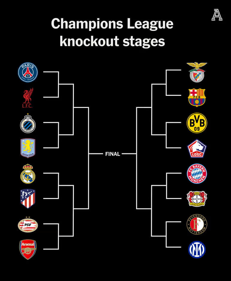 «Астон Вилла», занявшая восьмое место, попала в пару к клубу «Брюгге», который до прошлого месяца ни разу не побеждал в плей-офф Лиги чемпионов. «Барселона» сыграет с «Бенфикой», «Арсенал», занявший третье место, примет ПСВ, а «Интер», занявший четвертое место, сразится с «Фейеноордом».