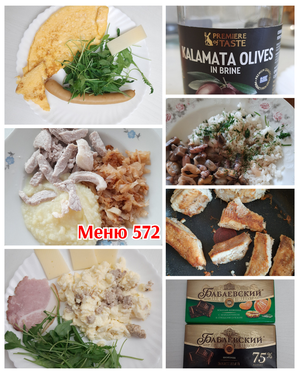 #Завтрак 1 – омлет с остатками фарша. Руккола. Окорок от фермера. Сыр. #Завтрак 2 – омлет с молоком, сыр, руккола. Сосиска с сыром из Вкусвилл – родственники привезли. Мне понравилась по вкусу. Про оливки. Смотрите, какие интересные оливки появились! Впервые такие вижу. До этого брала оливки в специях и вакууме. А это классическая консервация. Но это не окрашенные маслины. А именно зрелые темные оливки сорта Каламата. Состав прекрасный – оливки, вода, соль, винный уксус. Изготавливают в Греции. #Обед 1 – пюре с молоком и маслом. Тушеная капуста с топленым маслом. Тушеная на воде свинина, с солью и перцем. #Обед 2 – это я обжарила окуня. Ох и пришлось повозиться с его разделкой. Потому что он был без головы и чешуи. Но все остальные внутренности и плавники входили в комплект. И все же какая вкусная рыба, когда она цельная, а не спрессованная в квадратики. #Обед 3 – пропаренный рис. И морепродукты, обжаренные с луком на топленом масле. Сначала обжарила лук. Затем добавила полностью раз