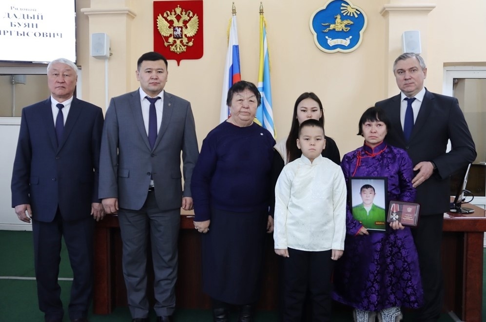 В Верховном Хурале (парламенте) Республики Тыва 20 февраля состоялась церемония посмертного награждения военнослужащих, героически погибших в ходе выполнения задач специальной военной операции. Указом Президента Российской Федерации за проявленные мужество, отвагу и самоотверженность во время проведения специальной военной операции Орденами Мужества посмертно награждены: - рядовой Бавуу-Доржу Шолбан Александрович, - ефрейтор Бояринов Александр Сергеевич, - рядовой Дадый Буян Кыргысович, - рядовой Намзырай Владимир Эрес-оолович, - ефрейтор Ооржак Аяс Май-оолович, - рядовой Сарыглар Артыш Седен-Дамбаевич, - рядовой Чудун Байлак Ноозунович, - рядовой Тулуш Артыш Александрович, - рядовой Даваа Иван Шоппурович, - рядовой Шемельков Егор Викторович, - рядовой Хайдып Аян-оол Монгун-оолович, - рядовой Даваа Ай-Темир Геннадьевич, - рядовой Чульдум Шолбан Байырович, - старший сержант Чооду Руслан Александрович, - рядовой Арагат Милан Михайлович, - рядовой Кидиспей Аяс Маадыр-оолович, - ефрейтор Х