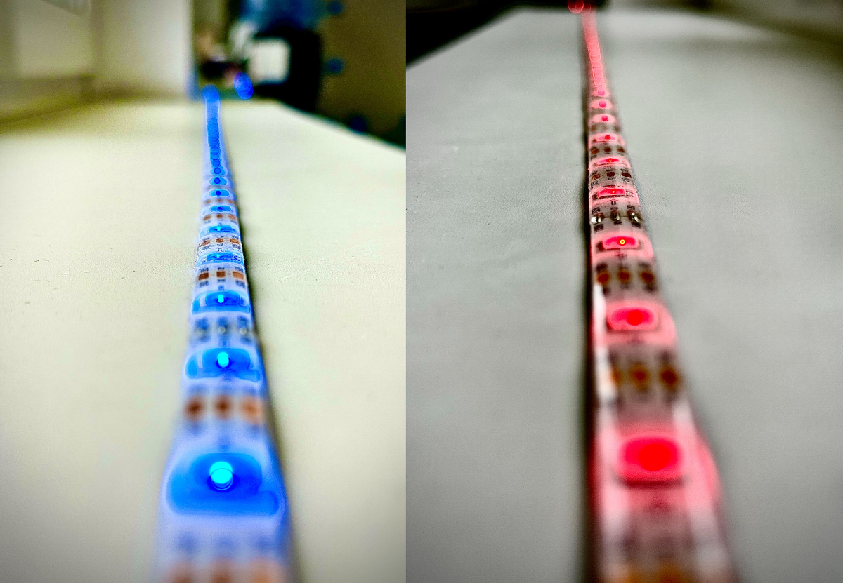 Когда температура в комнате поднимется выше 25°C, лента начнёт светиться ярким красным, сигнализируя, что в помещении жарко.