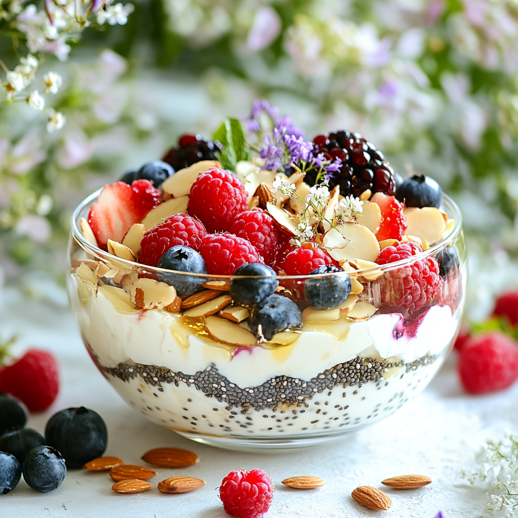 3️⃣ Посыпаем семенами чиа или льна, добавляем пару целых ягод сверху.