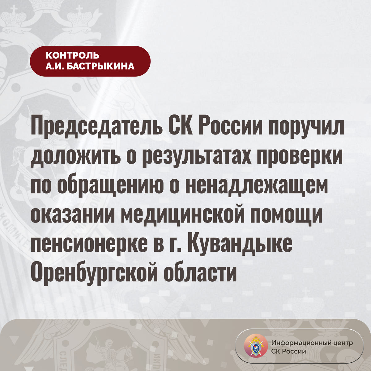 Председатель СК России поручил доложить о результатах проверки по обращению о ненадлежащем оказании медицинской помощи пенсионерке в г. Кувандыке Оренбургской области В комментариях в аккаунте Информационного центра СК России «ВКонтакте» обратилась жительница города Кувандыка Оренбургской области по вопросу ненадлежащего оказания медицинской помощи ее 86-летней матери, являющейся ветераном труда и имеющей статус «дитя войны». Ввиду ухудшения самочувствия в феврале текущего года пенсионерке было проведено обследование, которое выявило признаки онкологического заболевания. Однако до настоящего времени пожилой женщине не выдано направление на госпитализацию, ее состояние ухудшается, заявительница опасается за жизнь матери. Многочисленные обращения в профильную структуру результатов не принесли. В СУ СК России по Оренбургской области по доводам комментария начата процессуальная проверка. Председатель Следственного комитета Российской Федерации Александр Иванович Бастрыкин поручил руководит