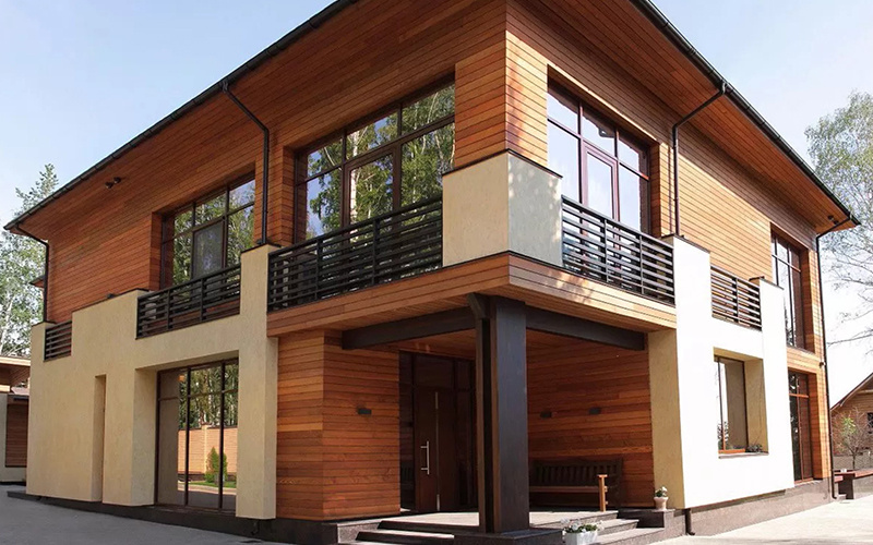 Для наружных фасадных работ лучше использовать древесину, устойчивую к перепадам температур и погодным условиям. Сосна и ель также используются, но требуют регулярного ухода и обработки для продления срока службы. Лиственница устойчива к влаге и температурным колебаниям, не деформируется и не разрушается, при своевременной обработке она может служить долгие годы. Термодревесина (например, термоясень или термососна) также является хорошим вариантом для наружных работ. Она стоит дороже лиственницы, но обладает улучшенными характеристиками влагостойкости, стабильности и защиты от бактерий и микроорганизмов благодаря специальной обработке в камерах высокими температурами и горячим паром.