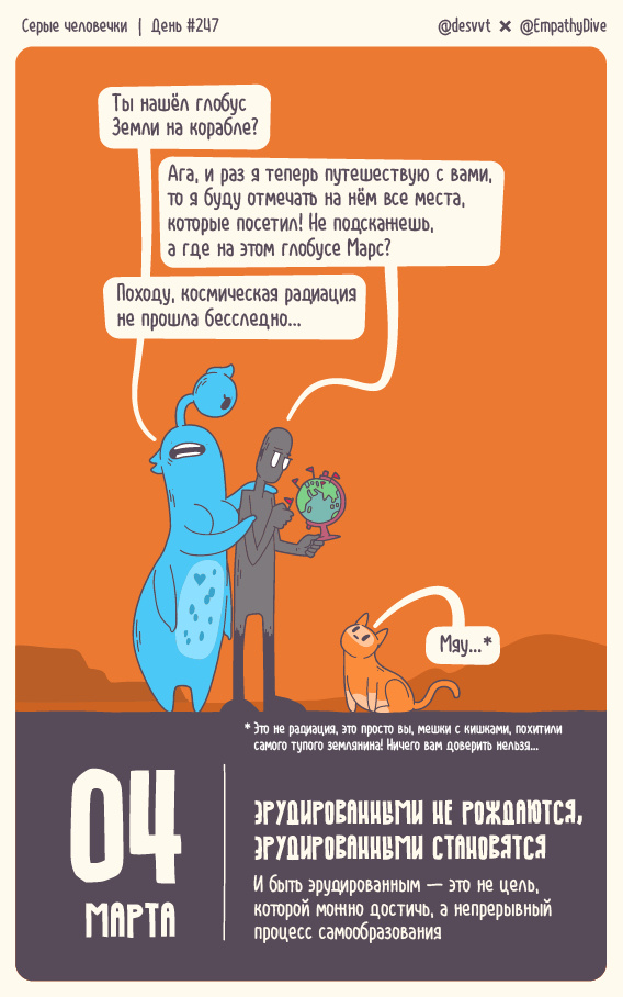 Проект Серые Человечки — совместный ежедневный проект-календарь иллюстратора @desvvt и психолога @empathydive длиной в год, в формате полувредные советы. Текст на комиксе является полезным советом по бытовой психологии, а персонажи в комиксе доводят все до абсурда, устраивают сатиру, перегибают со стереотипами, то есть всячески показывают КАК ДЕЛАТЬ НЕЛЬЗЯ. Все посты можно посмотреть в серии постов.
