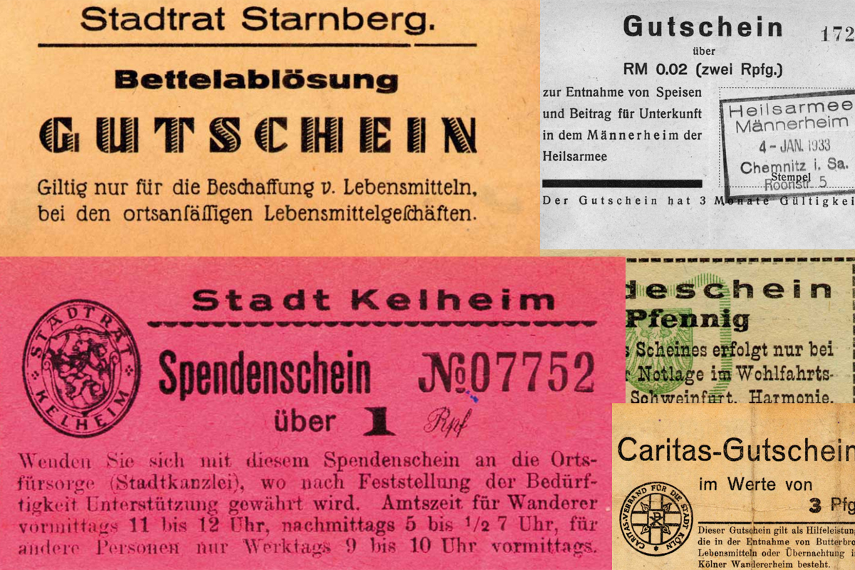 Нищенские деньги (также пособия или подарочные сертификаты) выдавались муниципальными и государственными учреждениями или благотворительными организациями нуждающимся для приобретения предметов первой необходимости. Они выражены либо в денежной сумме, либо в определенном количестве товара. Поскольку эти банкноты часто выпускались в те времена, когда существовали и чрезвычайные денежные знаки, не всегда легко отличить их от реальных чрезвычайных расходов без каких-либо сомнений. Следует отметить следующие особенности: сертификаты поддержки либо обозначаются как таковые, либо как аналогичные, но часто их можно распознать только в пункте выдачи (организация помощи и т.п.), либо они дают право только на приобретение определенных товаров (продукты питания, текстиль). Часто приобретение определенных товаров (например, алкоголя и табачных изделий) прямо исключено. Примеры: В Англии в XVIII-XIX веках в Рочестере существовали так называемые "ордера" (разрешения). Кёльн выпустил свои "военные ва