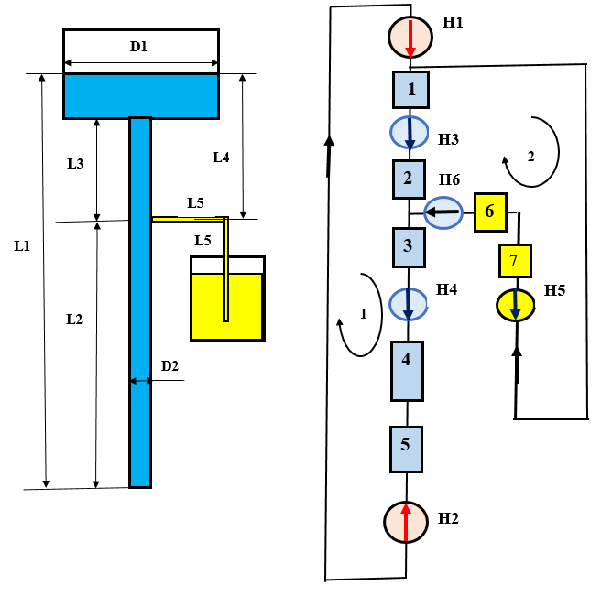 Дугинов Л.А. l.duginov@mail.ru Ключевые слова: вытяжной тройник, новый метод решения, сопротивления трения, лабораторная установка Введение В данной статье излагается новый метод расчёта гидравлической схемы лабораторной установки, а также способ моделирования вытяжного тройника, входящего в состав данной схемы ( ветви 2, 3 и 6) (см.рис.1). Рис.1 Эскиз лабораторной установки и её гидравлическая схема замещения H1-H2 - атмосферное давление, H3- давление водяного столба с L4, H4- давление водяного столба с L2, давление водяного столба с L=L5/4, Участки (сопротивления) трубы: 1- вход в вертикальную трубу, 2-4 -сопротивления трения воды о стенки, 5- выход из вертикальной трубы, 6 -сопротивление трения воды о стенки трубки L5, 7- вход в трубку с L5. Ниже даётся краткое описание нового метода расчёта гидравлических схем, путём применения итерационной формулы (3), краткий вывод которой даётся ниже. Краткий вывод итерационной формулы Примечание: формула (4) получается из (3) при n=2. Оп