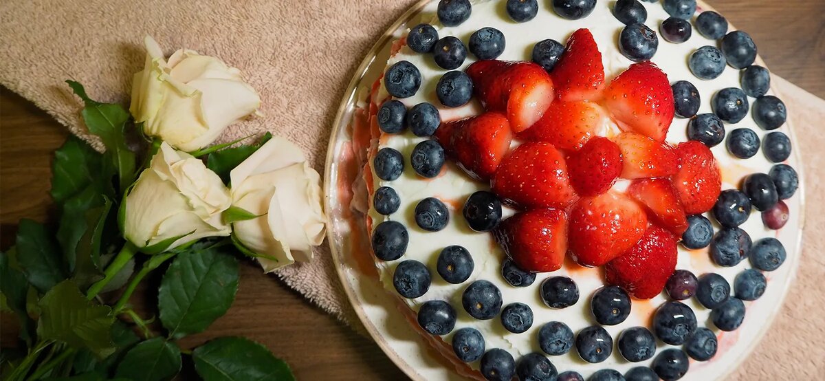 Торт почти готов — осталось украсить его свежей голубикой и размороженной клубникой. У меня не так много ягод, поэтому я выкладываю их по кругу, двигаясь от края к центру. Голубика (ее было 125 г) довольно быстро закончилась, поэтому центр я украсила дольками клубники.