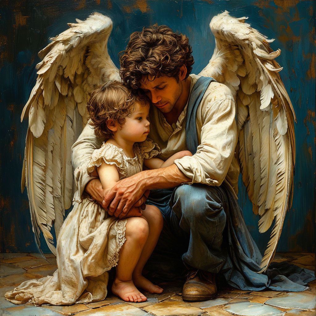 В ногах листва и ветви показывают мне сидящего на корточках ребенка и стоящего над ним ангела. Четко виден его силуэт и торчащие из-за спины два крыла, которые словно закрывают собой малыша.