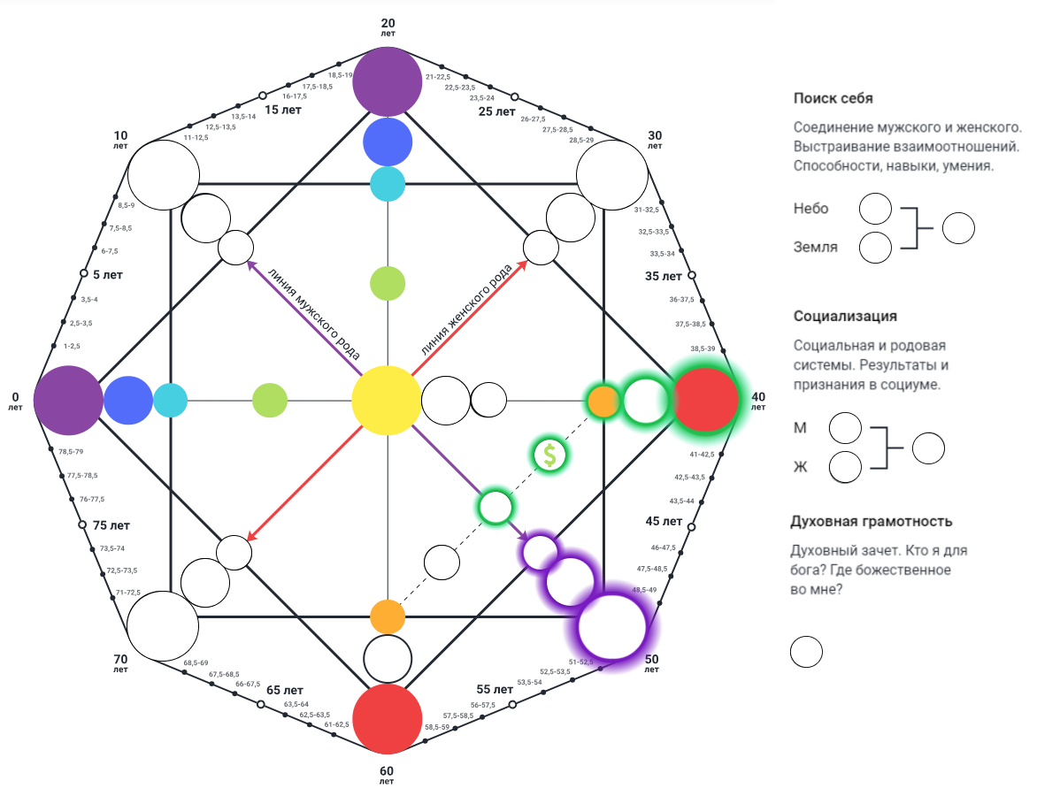 Фиолетовым цветом выделила материальную карму по роду отца. Задачи по папе рассказывают о негативных установках, которые можно было приобрести в финансовом плане, о том, с чем предки не справились, и о том, что нам помогает достигать целей.