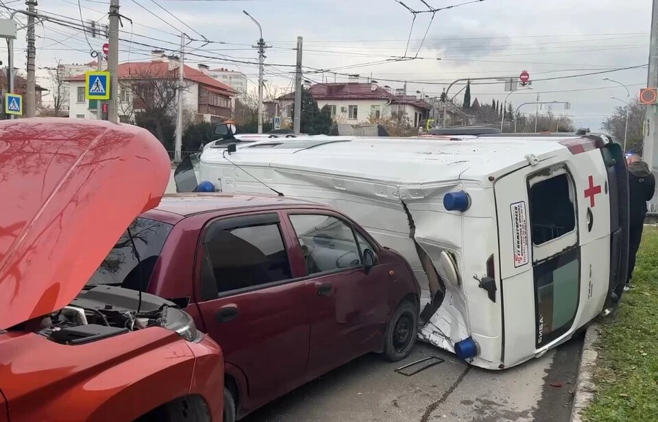 🚑 Автомобиль скорой помощи, Форд Транзит под управлением водителя 1980-го года рождения, имеющего полис ОСАГО, получило механические повреждения (в результате столкновения с Ленд Ровером, опрокинулся и по инерции проскользил, столкнувшись с другими автомобилями)