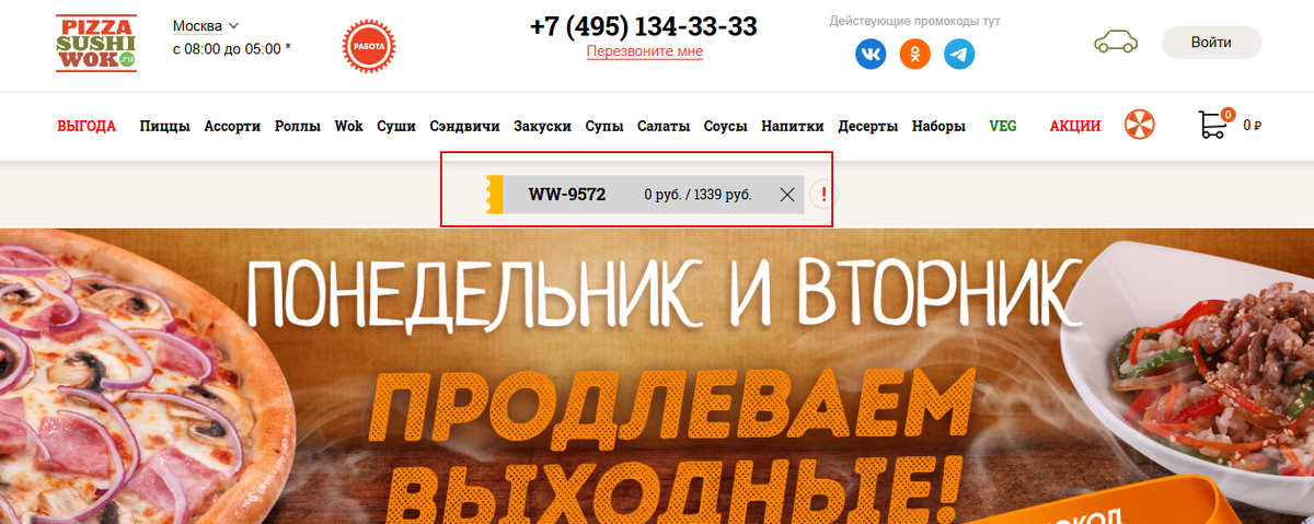 Я часто заказываю еду в «ПиццаСушиВок», и каждый раз остаюсь довольна! Меню просто огромное – можно выбрать и пиццу, и суши, и блюда вок. Особенно люблю их пиццу «Маргарита» – тесто тонкое, сыр тянется, как в Италии! Доставка всегда быстрая, курьеры приезжают вовремя, еда приходит горячей. Еще радует, что можно использовать промокод для скидки – недавно заказала ужин на двоих и сэкономила 20%. Рекомендую всем, кто любит вкусную еду и быстрый сервис!