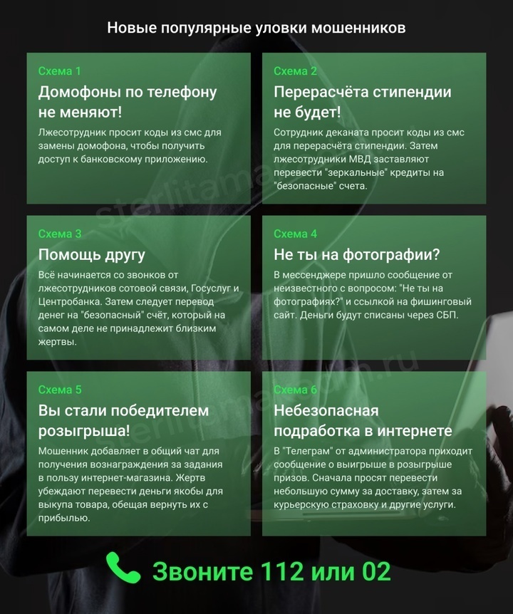 Одни из последних вы видите на карточке. Будьте бдительны и не дайте себя обмануть! Если вы или ваши родственники всё же стали жертвой мошенников, немедленно обращайтесь в полицию по телефону 102 (с мобильного телефона единый номер 112).