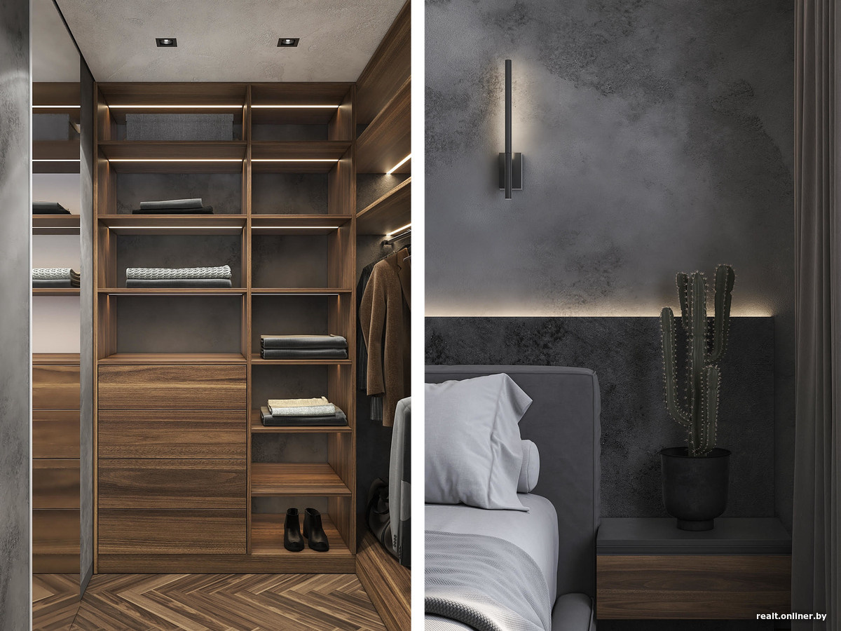 Вы когда-нибудь задумывались, как выглядит идеальная квартира для холостяка? А нам и представлять не надо, ведь мы уже заглянули в одну из новостроек Бреста, где скрывается эта двушка. Ее владелец хотел получить стильное и удобное пространство, в котором можно остановиться и отдохнуть после длительных командировок. Дизайнеру Алине Жучко удалось реализовать этот проект всего за шесть месяцев, создав интерьер, балансирующий между брутальностью и минимализмом. Площадь квартиры — 57 «квадратов». Она состоит из кухни-гостиной, спальни и санузла. Дизайнер постаралась грамотно использовать каждый метр. Особенно важно было предусмотреть достаточно мест для хранения: у заказчика много одежды и обуви. — Мы объединили санузел, чтобы выделить зону для дополнительного хозяйственного шкафа со стиральной и сушильной машинами, а также спроектировали отдельную гардеробную, — рассказала Алина Жучко. Большую часть жилья, как это обычно бывает в современных проектах, занимает кухня-гостиная. А вот спальн
