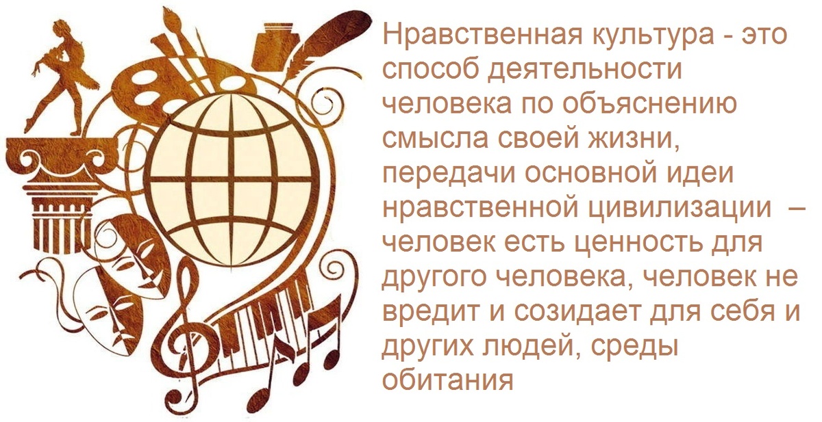 Нравственная культура - это способ деятельности человека по объяснению смысла своей жизни, передачи основной идеи нравственной цивилизации – человек есть ценность для другого человека, человек не вредит и созидает для себя и других людей, среды обитания.