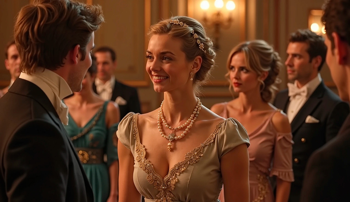 Эдвард обернулся и увидел женщину, которая могла бы стать центральной фигурой любого журнала мод: Леди Аделаида Уорвик. Её белое платье с глубоким декольте переливалось серебристыми нитями, словно лунный свет спустился с небес, чтобы осветить её образ. Волосы были собраны в сложную причёску, украшенную жемчужинами, а глаза смотрели так уверенно, что казалось, она знает всё на свете.