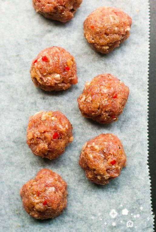 Разогрейте духовку до 190ºC и застелите противень пергаментной бумагой. Сформируйте из мясной смеси фрикадельки, размером примерно с неочищенный грецкий орех, и выложите их на противень.