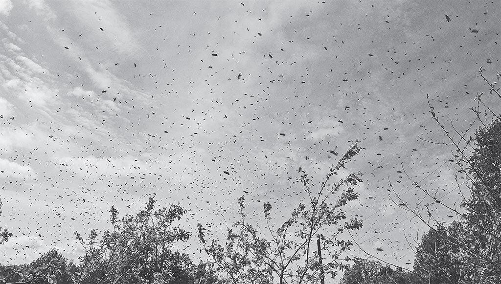 Это настоящее, дорогого стоящее зрелище. Как это выглядит – не спутаешь ни с чем. То, что происходит первые полчаса, в целом не похоже ни на одно другое действие пчелиной семьи. Первые минуты напоминают традиционный очистительный облет молодых пчел, но похожесть исчезает, как только число вылетевших пчел достигает неких критических значений. Вот только пять минут назад они, казалось, мирно занимались своими делами, как вдруг тысячи и тысячи их поднимаются на крыло и начинают летать над пасекой в радиусе пятнадцати-двадцати метров от родного улья. Помножьте звук от одной пчелы на количество летающих вокруг вас пчел, а их может быть от двадцати до шестидесяти тысяч, – и неопытному пчеловоду запросто может стать не по себе.