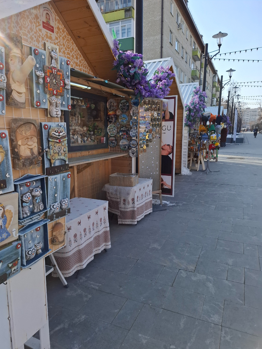 Торговые ряды с изделиями местных мастеров. Интересно, да. Но меня сегодня интересовали продавцы. И воспользовавшись отсутствием покупателей и народа вообще, на данный момент, а было 11 часов утра завела с ними разговор, как товар попадает на прилавки. Поняли к чему это я. Пообщались душевно, дали мне визитки, координаты групп. Понравилось то, что весь товар просматривают, чтоб не было китайского ширпотреба. Могут если мастер хорошо себя зарекомендует выделить отдельный домик. Все это какой -то отдел администрации занимается. Будем принимать совместное решение, продвигать или нет свою бересту.