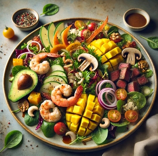 1. Салат с креветками и манго Ингредиенты: Приготовление: Ингредиенты: Приготовление: Ингредиенты: Приготовление: Этот салат сочетает хрустящие, сладкие и соленые нотки, а тыква делает его особенно необычным.