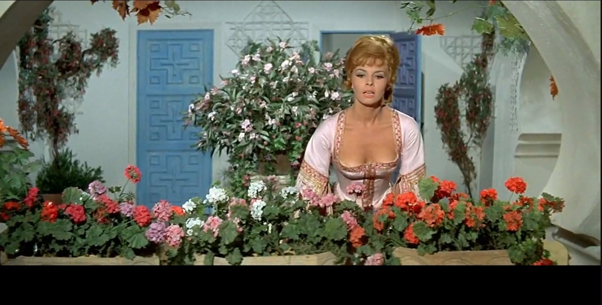 Все красавицы должны носить одинаковые черные мешки? Как только султан такое однообразие выдерживал? Или это была массовая закупка ткани для съемки фильма? Но почему её использовали для верхнего гарема, а не для нижнего? Ну подумайте сами. С чего бы это наложницам одеваться во все черное и одинаково? Может они в трауре? Может быть там для траура предусмотрен другой цвет, а черный наоборот — для торжественных случаев? Вот прошло уже много лет, а вопрос этот так и остался. Сейчас, когда мы все умеем во всем искать какой-то особый смысл и подвох, у меня возникла мысль, что кто-то просто удачно пристроил большую партию черной ткани, а кто-то освоил бюджет. Но давайте посмотрим на несколько фото из фильма, чтобы обсудить нелогичность и даже посмеяться над черной одеждой. Посмотрите на верхнее фото. В таком розовом наряде Анжелика очнулась, когда оказалась в плену у перекупщика красавиц. Посмотрите дальше. Великий евнух Осман Ферраджи не хотел представлять своему господину непокорную женщину
