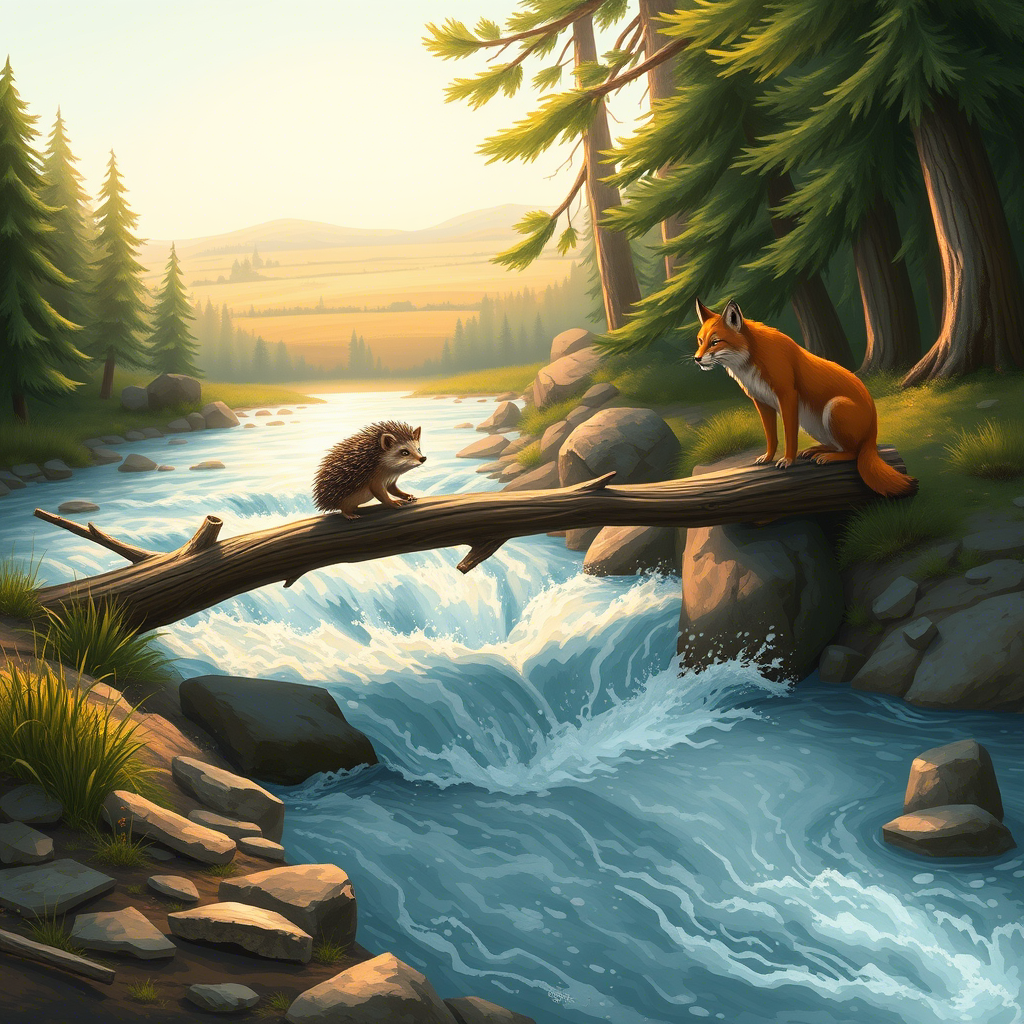Ёшка выбрался из чащи на рассвете. Небо алело, отражая в себе пробуждение нового дня. Лес остался позади – густой, мрачный, таящий свои тайны. Но впереди раскинулась равнина, залитая первыми лучами солнца. Он сделал глубокий вдох. Воздух был свежий. Свободный. — Ну что, маленький путешественник, — раздался голос Лары, — готов идти дальше? Ёжик взглянул на рысь. Она стояла на краю тропы, легко балансируя на камне. В её глазах не было ни намёка на усталость. — Готов, — кивнул он. Лара слегка прищурилась, затем махнула хвостом и первой ступила на тропу. Так началось их путешествие к озеру. Они двигались вдоль равнины. Земля под лапами была мягкой, но временами попадались каменистые участки. Там, где вода стекала с гор, образовывались небольшие ручьи. Некоторые из них можно было перейти вброд, но один поток оказался слишком бурным. Ёшка остановился на берегу, разглядывая кипящую воду. — Нам нужно найти обход, — сказал он. — Или перебраться здесь, — парировала Лара. Ёжик скептически посмотр