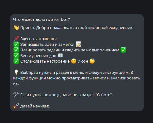 Бот позволяет вести дневник, где можно записывать важные события, мысли и наблюдения в течение дня. Эти записи помогут тебе анализировать прошедшие дни, недели и месяцы.