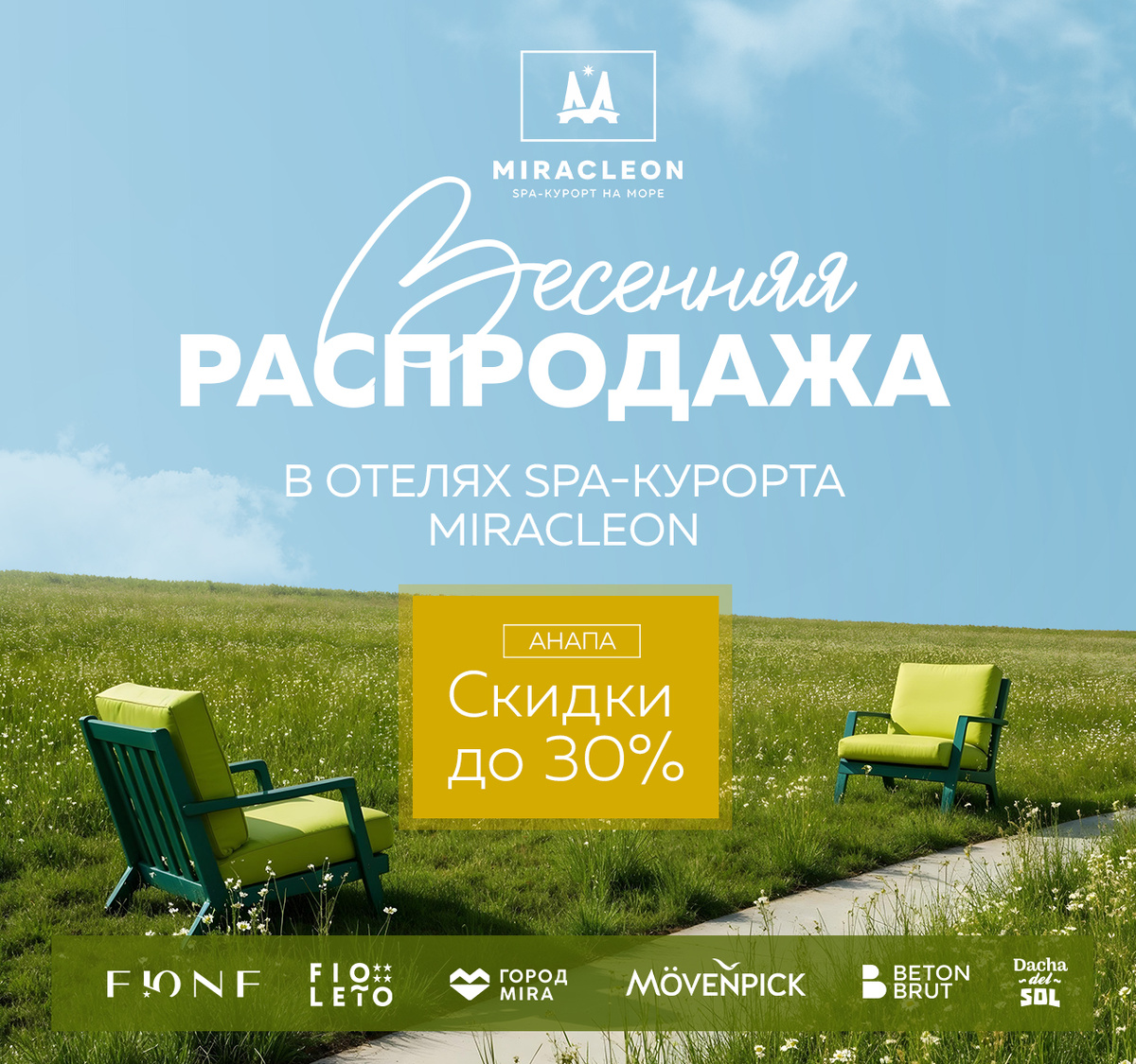 Всесезонный спа-курорт Miracleon, расположенный на Черноморском побережье Анапы, объявил о большой «Весенней распродаже». В период с 3 по 16 марта можно забронировать номер в отелях спа-курорта с 30% скидкой.