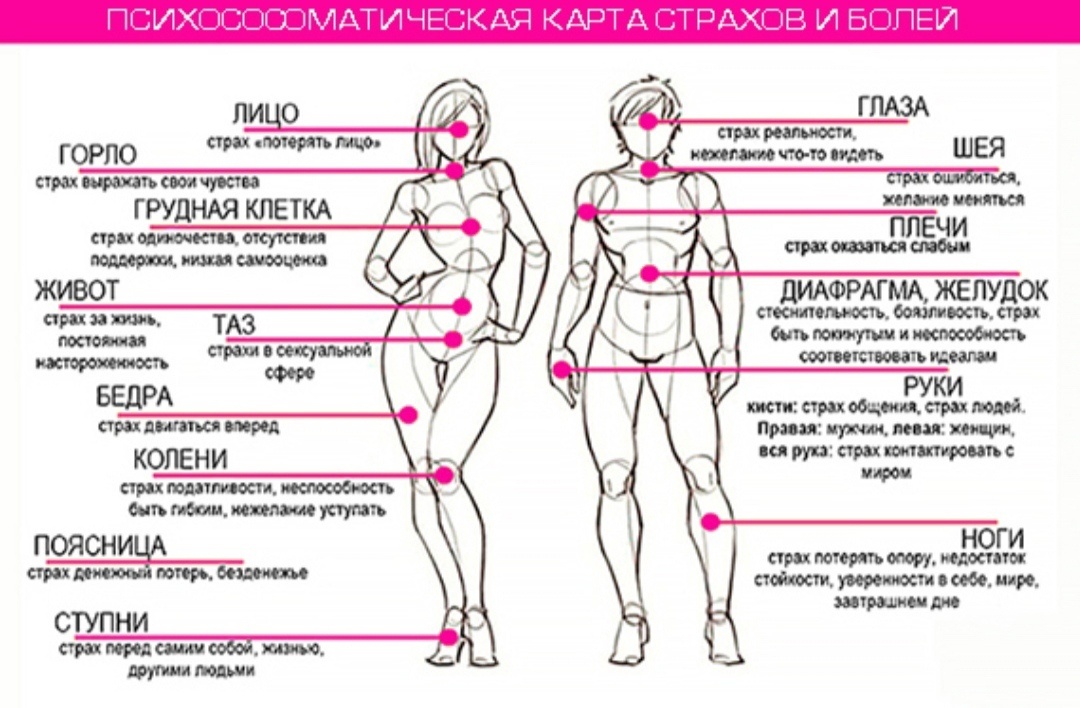 Где есть боль, там есть и страх что-либо делать, который блокирует определённые проявления человека. Например, боли в ногах могут говорить о неуверенности в себе, о том, что человек не идёт туда, куда ему нужно по жизни, чего-то боится.