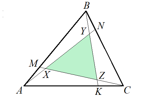 Рассмотрим решение задачи на вычисление площади треугольника в неочевидной ситуации. 1. Площадь треугольника ABC равна 52. На сторонах AB, BC, AC отмечены точки M, N, K соответственно, делящие стороны в отношении 1 : 3 при обходе по часовой стрелке. На пересечении отрезков, соединяющих точки деления с противолежащими вершинами треугольника, образовался треугольник XYZ. Найдите его площадь. Решение. Так как BN составляет 1/4 BC, то площадь треугольника ABN составляет 1/4 площади треугольника ABC, она равна 13. Площади треугольников BCK и ACM также равны 13. Отрезок AB разделим на 4 равные части и через точки деления проведём прямые, параллельные AN. По теореме Фалеса отрезок BN разделится на 4 равные части. Одна четвёртая отрезка BN укладывается в отрезке CN 12 раз, так как CN = 3BN. Через точки деления на отрезке CN проведём прямые, параллельные AN, они, по теореме Фалеса, разделят отрезок AC на 12 равных частей, и одна из прямых пройдёт через точку K, так как KC составляет четверть KC