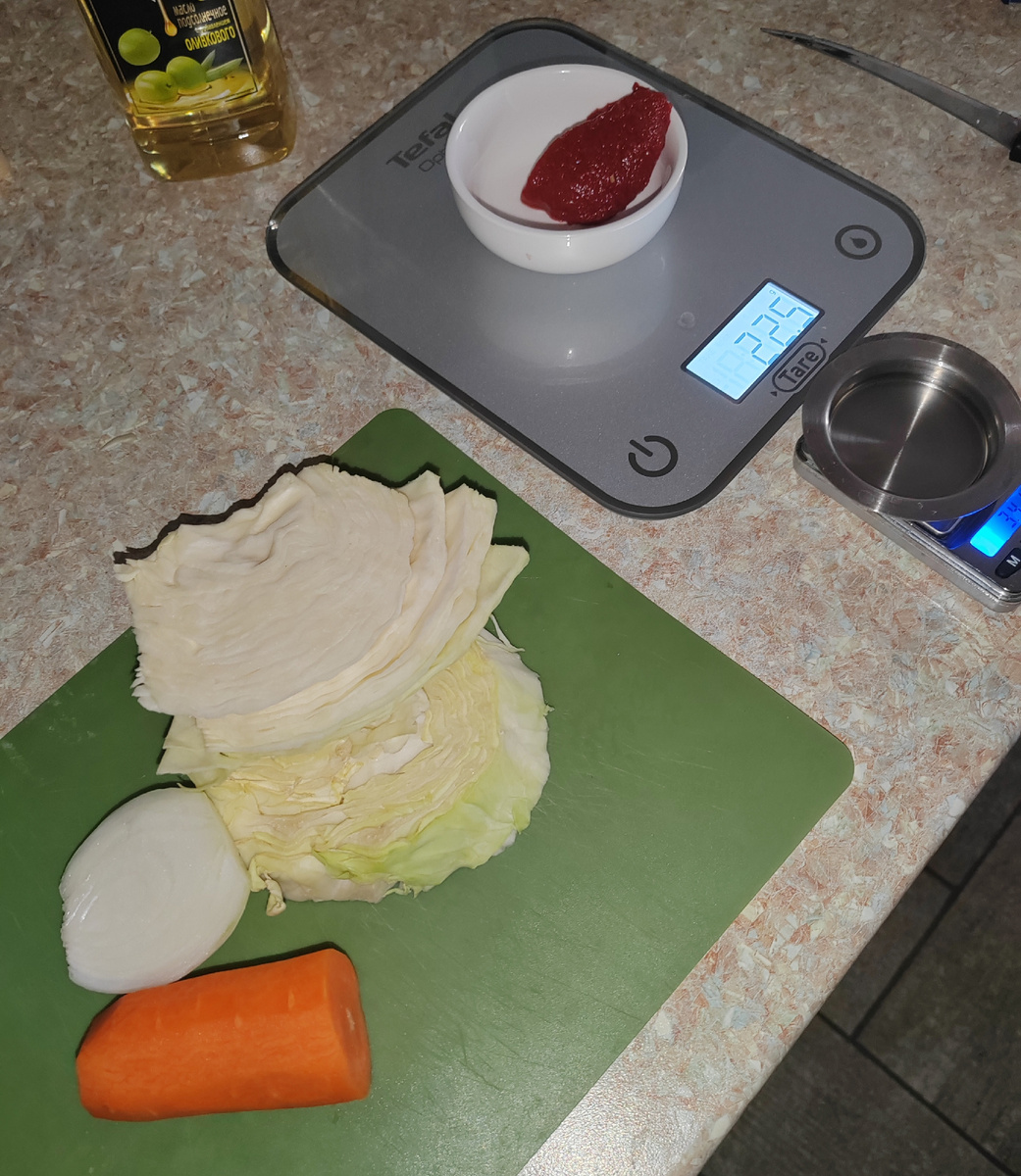 Капуста, лук, чеснок, морковь, томатная паста, масло подсолнечное.