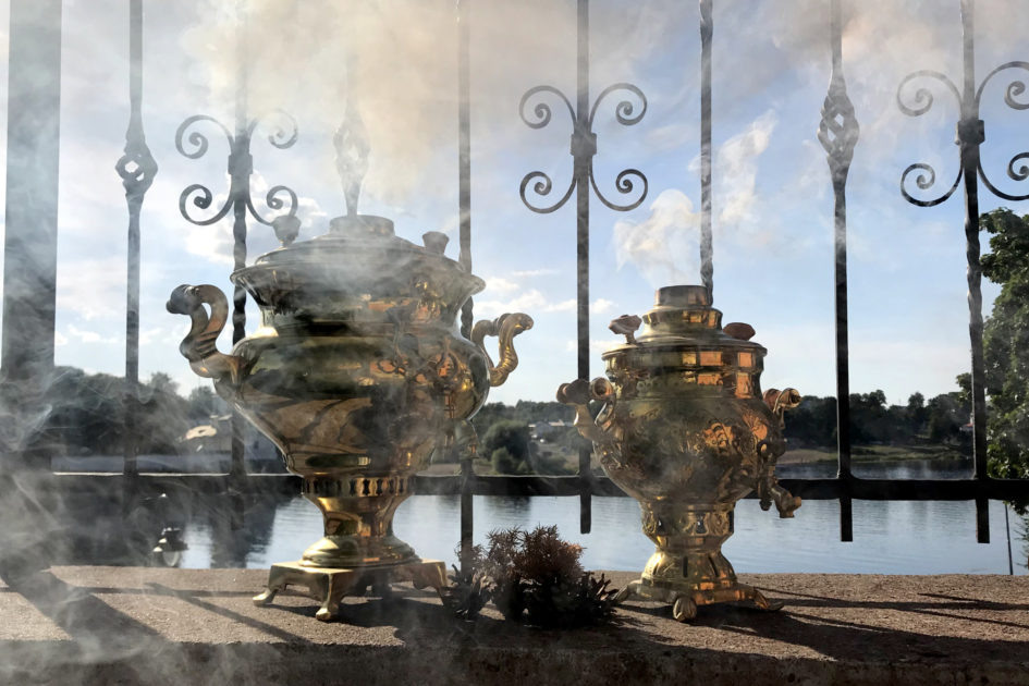 Русский и иранский самовары, шишки и можжевеловые веточки. © Ольга Никандрова