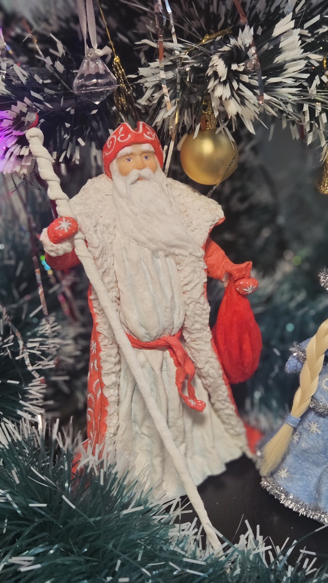 Всем привет! Я продолжаю делать Деда Мороза из ваты под ёлочку младшему сыну. Ссылки на первые две части оставлю в конце статьи. Так же будет статья с материалами. Все соберу в одну подборку. Пришло время облачать дедушку в шубку. Мне видится красная распахнутая шуба подбитая белым кудрявым мехом. Сейчас я бы сделала шубу по-другому, как делала платье. Сначала нижнюю часть одела бы, просушила и добавила верхнюю часть. Но в тот момент я решила делать шубку из цельного полотна. Совместила два куска ваты шириной примерно 22 см и высотой около 15 см. Наметила где у игрушки руки, надорвала немного вату, промазала клеем все полотно с двух сторон и одела на дедушку. Получилось больше похоже на плащ, чем на шубу. Но ни о каком выравнивании и добавлении объема не могло быть и речи, полотно получилось тяжелое, постоянно сползало, пришлось, кое-как закрепив его на плечах, оставить так до полного высыхания. После того, как шубка просохла, я нарвала красную вату полосками и стала добавля