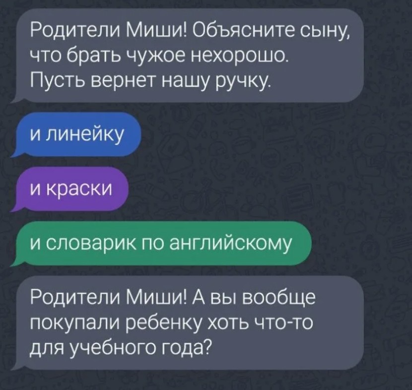 Если бы существовал чемпионат по выживанию, родительский чат школьников занял бы первое место. Там можно увидеть всё: от поисков потерянных носков до войн за сбор денег на занавески. Я долго не заходил в наш чат. Берёг психику. Но однажды решил прочитать, что там пишут. И… зря. Вечер. Я мирно пью чай. Телефон взрывается уведомлениями. Чат ожил. 172 новых сообщения за 10 минут. Я открываю, читаю первое: — Коллеги-родители! Кто-то что-то слышал?! О чём слышал? Кто-то? Что-то?! Но пока я пытался осмыслить смысл этой фразы, чат уже полыхал. — Да, это ужасно! — Как так можно?! — А у нас такого нет!!! Я начал паниковать. Что случилось?! Землетрясение? Учительница сбежала? В школе объявили, что теперь обеды платные? Я пролистал вверх и увидел начало. Оказалось… просто какой-то ребёнок сказал кому-то, что завтра будет контрольная. Вот и всё. Но война уже началась. Начался допрос. — Кто сказал?! — Нам официально об этом не сообщали!!! — Может, это неправда? — Тогда почему мой сын сказал, чт