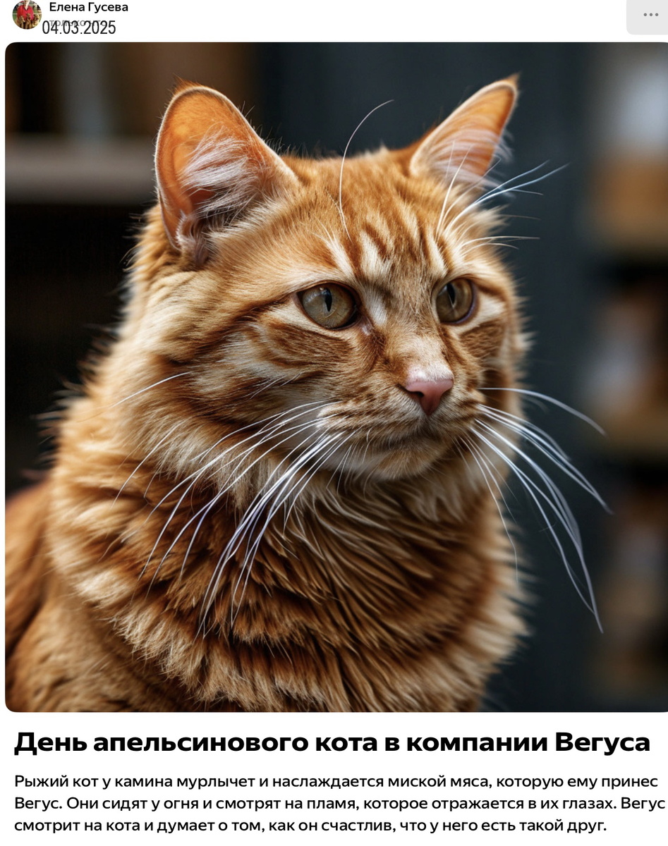 «Рыжий кот у камина мурлычет и наслаждается миской мяса, которую ему принес Вегус. Они сидят у огня и смотрят на пламя, которое отражается в их глазах. Вегус смотрит на кота и думает о том, как он счастлив, что у него есть такой друг. Вегус - это вельштерьер, который живет в деревенской избушке и любит проводить время на свежем воздухе. Он всегда рад встретить нового друга и поделиться с ним своими приключениями. Сегодня Вегус решил сделать для своего рыжего друга особенный подарок - день апельсинового кота. Он купил целую миску свежего мяса и приготовил его на гриле, чтобы кот мог наслаждаться его вкусом. Рыжий кот был очень рад такому подарку и с удовольствием ел мясо, сидя у камина. Они провели весь день вместе, играя и наслаждаясь друг другом. Когда солнце начало садиться, Вегус и его друг отправились на прогулку по лесу, наслаждаясь свежим воздухом и красотой природы. Они остановились у ручья, где Вегус научил рыжего кота ловить рыбу. Вечером они вернулись домой, где их ж