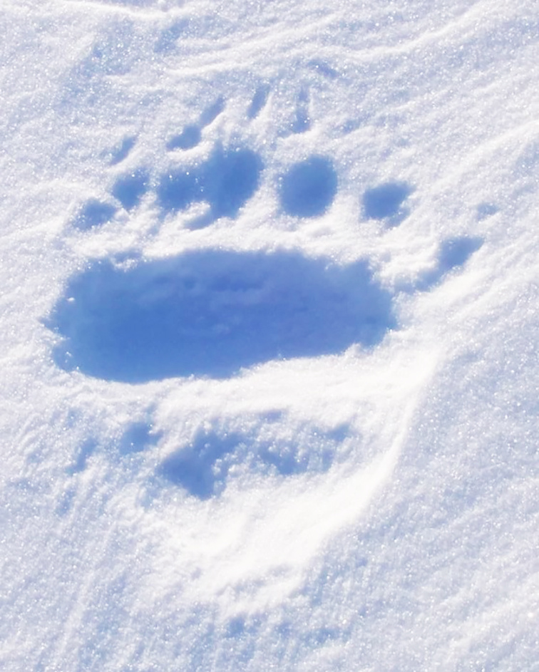 Если медведь не впал в спячку или проснулся раньше времени, его следы могут встретиться на снегу. Они похожи на отпечатки человеческой ноги, но гораздо крупнее и с отчётливыми следами когтей. Иногда можно увидеть, где зверь переворачивал снег в поисках корма.