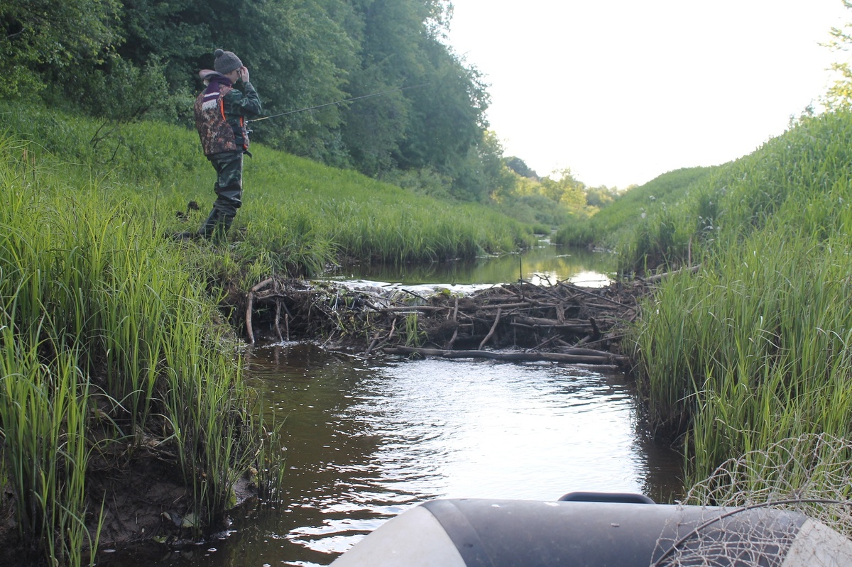 Вот товарищ бобр подпрудил пересыхающий ручеек, бегущий из озера. Понастроил плотинок - стало можно и плыть, а не по грязи пешком к озеру идти, хвост волоча. И веткосплав к норам с запасами, их у бобровой пары много, по каналу пойдет... А вот оригинальная запруда бобровая - прямо вокруг бетонной трубы, по которой течет ручеек под проселочной дорогой. Неслабо потрудился бобрище для создания собственного водоема, даже деревья приволок! А где живет товарищ, который тут кольев натыкал и глиной их замазал - неизвестно, вход в его нору - где-то в стороне под водой получившегося прудика. Однако, сначала он уровень воды прикинул, нору копая, потом колья воткнул, сучьями переплел их и глиной замазал. Интересно, человек смог бы такое одними руками сделать? А плывешь по Вятке вдоль крутого берега в межень - а берег-то, оказывается, весь подкопан. Вода опустилась до минимума и стали видны кругом черные норы и ходы подземные. Раньше-то они прямо в воду уходили. А с сумерками вылазят из них толстые