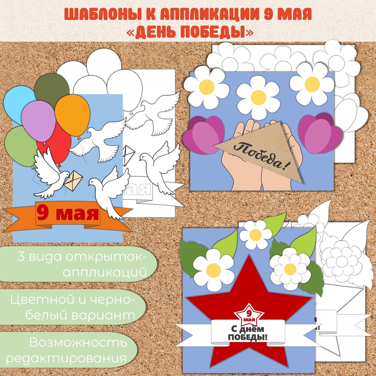 Шаблоны-заготовки к аппликации «9 мая», День Победы Материал содержит 3 вида открыток-аппликаций. Каждый вид открыток имеет 2 варианта исполнения - цветной и черно-белый. Файл в формате PDF и PPTX. Есть возможность редактирования. Каждая деталь в формате png. Можно менять размеры всех деталей