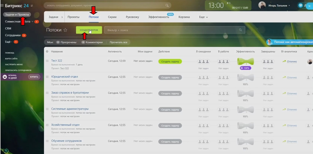 1. Перейти в раздел "Задачи и Проекты" и открыть подраздел "Потоки".
