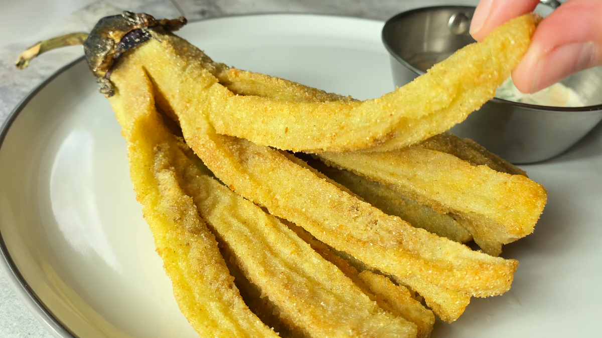 Идеальная закуска, которая украсит ваш стол. Баклажан, нарезанный в виде осьминога, в панировке и с ароматным соусом — это невероятно вкусно. Ломтики выходят очень нежными и сочными благодаря кукурузной муке. А соусу я готова петь оды, настолько он многогранный и освежающий. Обязательно попробуйте! Для баклажана: Для соуса: 1. Подготовьте баклажан. Очистите баклажан от кожицы, но не срезайте хвостик. Сделайте 3 надреза вдоль, немного отступив от основания. Переверните набок и сделайте ещё 2 надреза. 2. Уберите горечь. Налейте холодную воду в миску по размеру баклажана. Добавьте соль, перемешайте и замочите баклажан примерно на 10 минут. Это нужно, чтобы убрать характерную горечь. 3. Приготовьте соус. Порубите небольшой пучок петрушки. Мелко порубите 1/2 чили перца. Переложите всё в миску. Туда же прессуйте 2 зубчика чеснока, добавьте греческий йогурт, соевый соус, мёд и щепотку соли. Всё хорошо перемешайте. 4. Подготовьте всё для панировки. В миске взбейте одно яйцо до однородности. От
