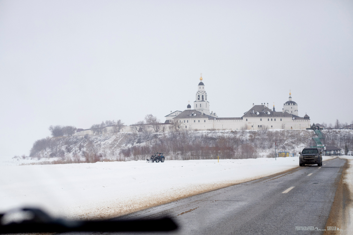 Весь Свияжск неторопливо обходится пешком за несколько часов. Город стоит на холме, окружён водой. В сезон, должно быть, очень живописно. Ну а пока кругом белое безмолвие, и даже берега просматриваются из-за начавшегося снега с трудом.
